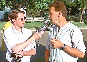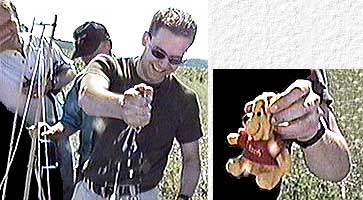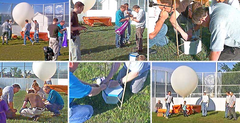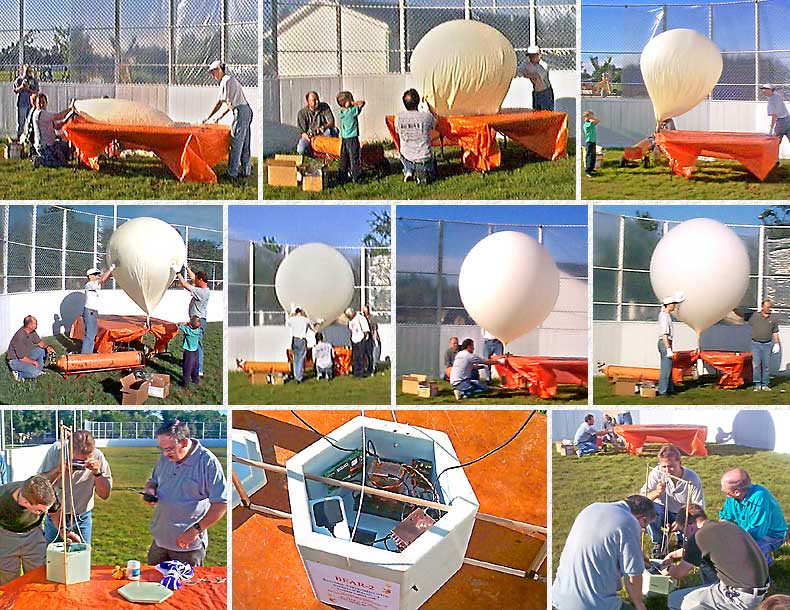 Everything appeared fine on the workbench, but a problem with interference to the cross-band repeater was discovered at the last minute that we frantically tried to resolve. The interference turned out to be from the camera's micro-processor and the problem was just now discovered as the digital camera and repeater had never been operated together at the same time before. There was only one solution which was to unplug the digital camera! The camera was a last minute addition and it's picture quality was not that great anyway. The payload was then quickly taped closed as Matthew (son of James, VE6SRV) had the honour of holding down the filled balloon.