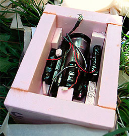 Right - This photo taken after recovery shows how the camera was packaged and kept in place. The two 5 AA cell batteries were placed on each side of the camera, small foam blocks were placed in front and behind it, and the box was sized so the center piece of foam in the lid would keep the camera from moving vertically. A UV filter was used to keep water from entering the camera through its lens opening in the event of a water landing and a rubber sun shade screwed onto the filter and that fit the opening in the box tightly was used to keep water from entering the box through the opening. |