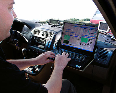 camera and could have been much worse, but again we were lucky and we should have taken time to ensure the camera's view wasn't affected by the foam around the hole it had to peer through and affects the corners of the image. Garrett created a perfect spot for his laptop in our vehicle by simply replacing the glove box with a home made wooden shelf. In addition to his laptop, a high-speed wireless modem, Garman Nuvi 350, a second GPS and several amateur radio transceivers were used to receive tracking data, talk with others and do everything else being done. With an internet connection, a laptop and Google Earth is all one needs, and my favorite way, to track a balloon and keep track of where the other vehicles in the group are, but Garrett was also using a Garmin Nuvi 350 and busy running a number of different programs to make landing predictions plus log and I-Gate received data to the internet for others. Feeding data from the tracking vehicles to the web was especially important as we would soon be out of range of any digipeaters and I-Gates where we would be going. And for those that keep asking how we track and make landing predictions, Garrett does a much better job of explaining what all he does then I can and his reply to one of those requests is HERE.