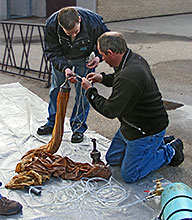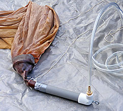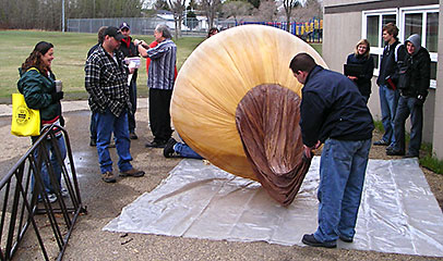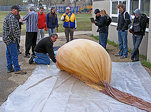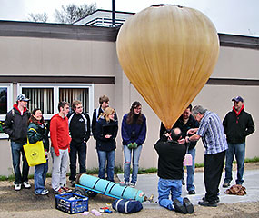 Garrett & James used a 'duck tape adapter' to fit the smaller then usual balloon neck to our filling tube and began filling the main balloon section. |