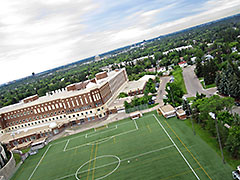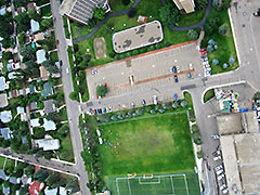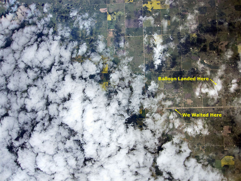 Image 396v is one of the few later images with some ground detail and third last before the rest were lost. Hopefully the lost images can be recovered as one can see from the image that the edge of the cloud bank had been reached and the image above of us walking to recover the payload shows that the sky was clear later on and during the descent. Left - A small cropped portion of image 396v shows where we were waiting for the balloon to burst and where it landed. (Balloon burst 39 min's later at 91,952 ft.) (With a better lens and more pixels would could have actually seen us waiting.) Image 010v is also a cropped image to better show the construction cranes seen, bottom center, in image 011v that also shows the launch site with our vehicles and everyone in the upper left corner of the green playing field. The close proximity of the cranes on a multi-story building is why we decided to go with a high ascent rate for BEAR 7 & 8 (besides the fact that we didn't want to drive very far to recover the payloads). Image 029h not only shows the Whitemud Drive, Quesnell Bridge and Fort Edmonton Park near the center, but also Story Land Valley Zoo, Anthony Henday Drive with its bridge and many other well known areas. More images and video news coverage of the BEAR-7 & 8 balloon flights with the UofA ISSET Space Academy program can be found on the ISSET web site under Outreach Programs / ISSET Space Academy. Some additional flight data: Average Ascent Rate was 1280 ft./min. and Average Descent Rate below 10K ft. was 2926 fpm (33 mph). |
