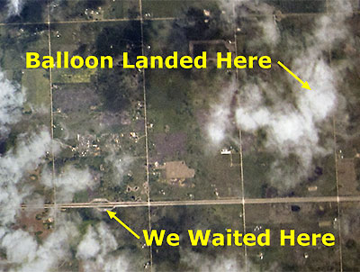 Click on the Map for a larger Image or download this BEAR-8.kml file to view the flight path in Google Earth. As predicted, the balloon headed east, followed highway 16 for the later part of the flight and landed just north of the highway, ≈ 2 miles from where we stopped to wait for it to burst. As usual, we spent time watching the balloon while waiting and this time James got lucky and even saw the balloon burst while using binoculars. But most amazing was that he was not only able to see the balloon burst in much greater detail then usual, but also see the payload as it fell at ≈125 mph before it was eventually obscured by clouds. Now we have one more thing to add to our list of things to bring with when tracking and recovering payloads - a camera with a large lens or attached to a telescope. |