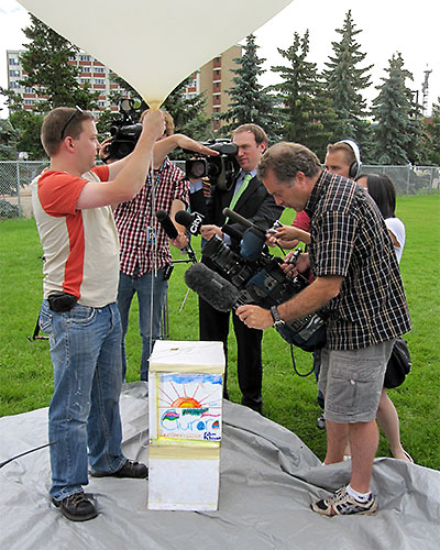Right - Garrett tried to avoid the media, but found himself explaining how the payload was tracked and recovered. The capsule with it's space explorers was simply added on top of the capsule used for the first flight to save having to reinstall the tracker and cameras in a different capsule. |