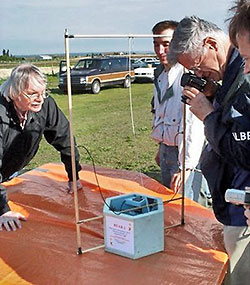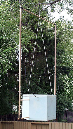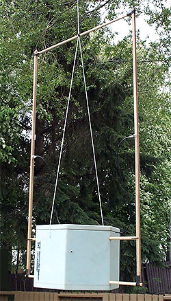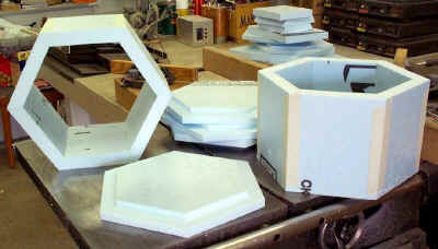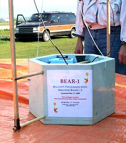 Here glass cloth is being applied to the exterior of the box. Box is 12" in diameter, 8" high and constructed of 1" thick foam board. Completed box weight was 219 grams (7.7 oz). The covering adds strength, protects the foam from impact damage and the additional 15% weight is well worth it if the box is going to be used again. (the extra weight is actually <5% when the other capsule components, like the antennas and parachute, are considered. |