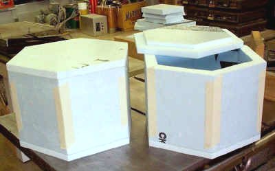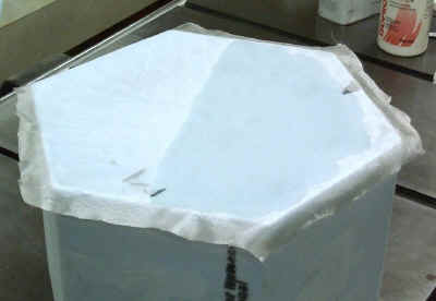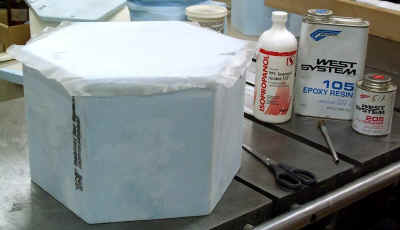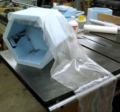 Extremely light (0.6 ounce) fiberglass cloth was applied after lightly sanding the foam pieces. The cloth is cut to size and positioned on box. |