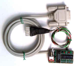 The programming cable contains a RS-232 to TTL/CMOS serial interface converter built on a small prototyping PCB and connects the RS-232 serial port DB-9 connector of a PC to the 6 pin connector on the tracker assembly. The RS-232 converter I.C. has 2 receivers and 2 transmitters and handles both the MIM and GPS serial port signals. The circuit board also has LED's that monitor data transmission, Red LEDs for the Tx data from the tracker to the PC and Green LEDs for the Rx data from the PC to the tracker unit. |
