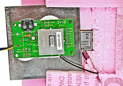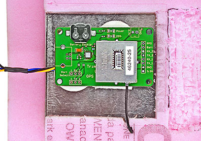 Ceramic antennas, like the one used, work better with a ground plain and the thin 3" square piece of metal used for one provided a convenient way to install the GPS receiver and antenna into the lid of the payload container.