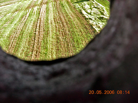 (left) Seeing the payload & antenna instantly answered why data transmissions were not received as 95% of the antenna element was missing. Only the small stub of brass tubing used to splice on the longer missing element remained which had snapped from stress as the antenna was dragged across the fields. |