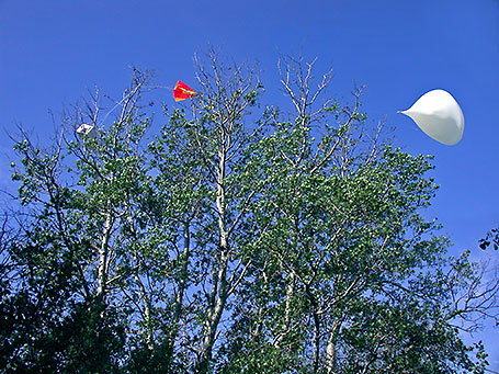 Even without GPS data, using Google Earth, land features and shadows it was possible to locate quite accurately where, and in which direction, 6 of the 8 payload photos were taken and determine SABLE-1's path, speed, distance travelled and what happened while SABLE-1 was out of view. If you have Google Earth installed, download SABLE-1.kmz and follow SABLE-1 from where it launched to where it became tangled up in trees and was recovered. If not, get & install it from Google Earth first. So why did SABLE-1 never get much higher than 100 feet? My first thought was that down drafts from the strong wind were the reason, but after writing the above and a lot of thought, I'm sure that if winds had been much lighter to permit the free lift to be confirmed outside after everything strung together and tied to the balloon, we would have found that it was much less than the 1 lb we thought it was. Different scales of unknown accuracy were used to weigh individual SABLE components and the weights were totalled, but scale accuracy errors and even small errors due to the rounding off of a number of individual weights all add up quickly. It would have been better to use a single scale of known accuracy for all measurements, but best is to simply weigh everything making up the balloon's load together, as a single item. And it's difficult to measure balloon lift using a scale and easier to simply add 1 lb, for free lift, to the weight the balloon must carry aloft, subtract the filling device weight, fill a plastic pop bottle with sand or water until it weighs the same as this result and tie the bottle to the filling device while the balloon is filled with helium. When the balloon, filling device and bottle all become neutral buoyant the balloon will contain the correct amount of helium. Update: Further information regarding free lift has been found.