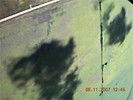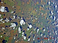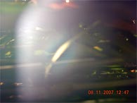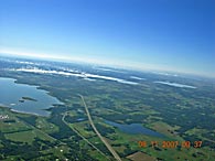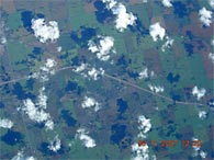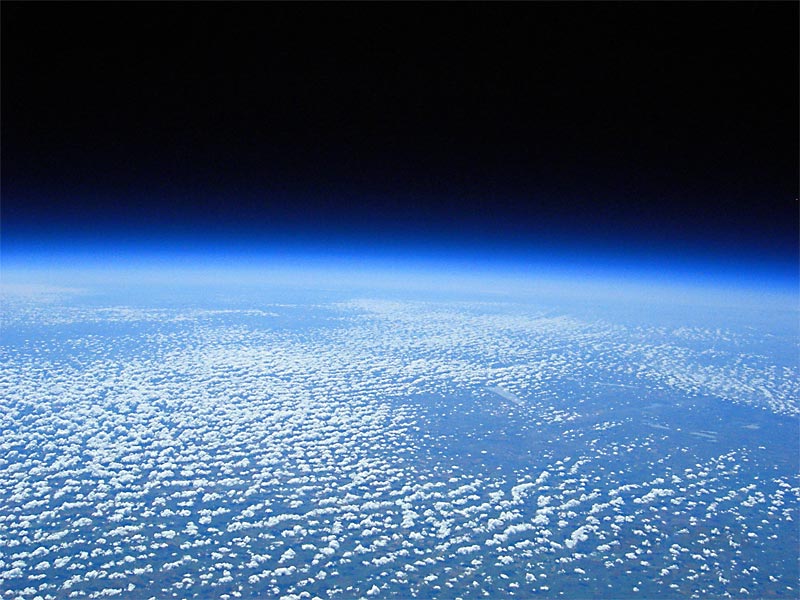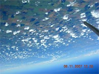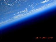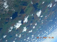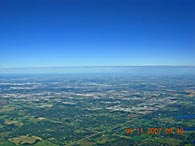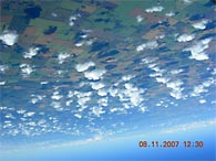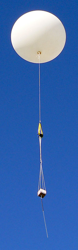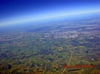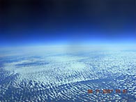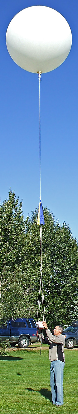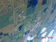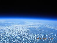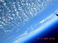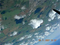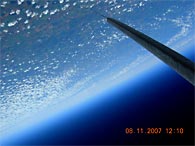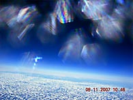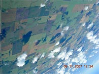 SABLE-3 was launched on Saturday, August 11th, 2007, at 9:31 AM with a payload, consisting of a Nikon Coolpix P2 digital camera set to take 1 image every minute and a Byonics MicroTrak 300 APRS Tracker, that the Kaysam 1200 gram balloon carried to over 117,597 feet. The last payload camera photo from the ground was just before it was launched, at 9:31 AM, and the last photo before the balloon burst was the photo above, at 12:01 PM, exactly 2½ hours or 150 images later. And what a photo. The composition couldn't have been better or the horizon more level and out of the 196 images taken during the flight, only 1 other image is as good. What are the chances? |