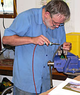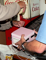 (left) yours truly assembles a battery pack for the tracker using Lithium AA cells and then .......... (right) Tony & I close & seal up the payload package after switching on and ensuring the tracker and camera are operating correctly. |