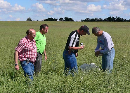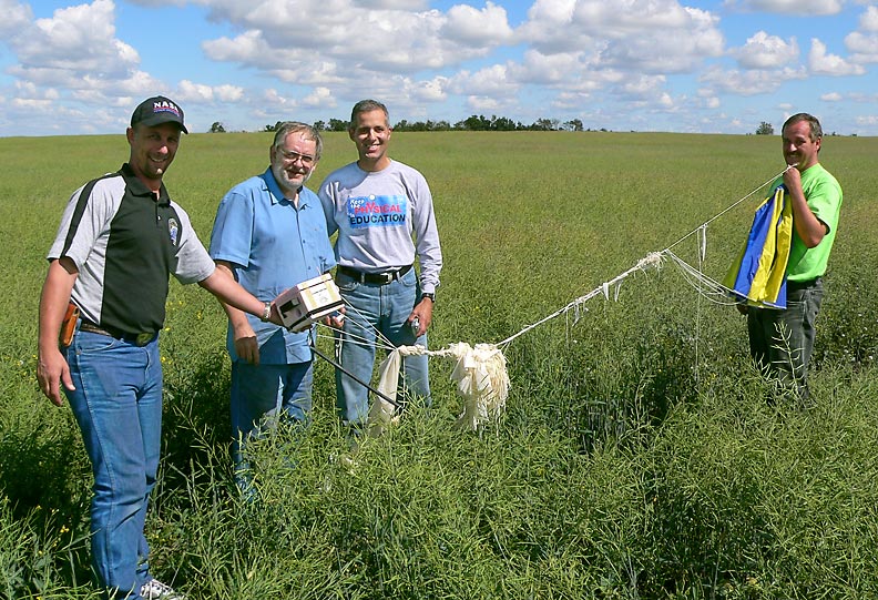 ![]() Above (from L - R) - Brian VE6JBJ, myself - Barry VE6SBS, Tony VA6TNY, and James VE6SRV with the tangled remains of the balloon, parachute, payload package and antenna. |